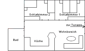 Neben zwei separaten Schlafzimmern befindet sich ein offener Wohnbereich mit Sat-TV und ein helles Bad.
